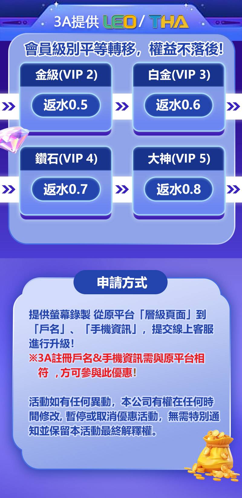 3A提供 LEO/THA 會員級別平等轉移,權益不落後!